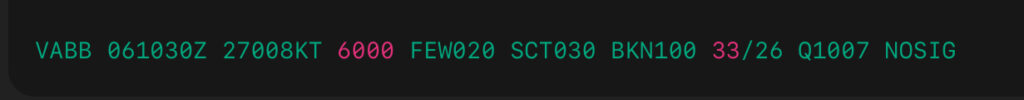 At 10:30 UTC on the 6th, Mumbai (VABB) reported winds from the west at 8 knots, visibility 6 km, a few clouds at 2,000 ft, scattered at 3,000 ft, broken at 10,000 ft. Temperature was 33°C, dew point 26°C, QNH 1007 hPa, and no significant weather changes expected.